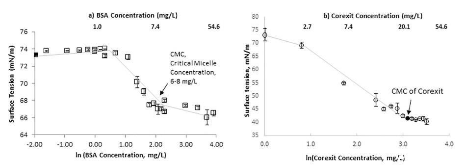 图 4.a) 显示了海水中模型蛋白质的 SFT 作为其浓度自然对数的函数。 BSA 蛋白的 CMC 为 6–8 mg/L。 b) 显示 Corexit 的 CMC 浓度为 22 mg/L。
