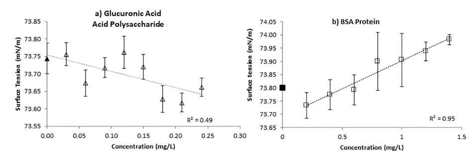 图 5.a) 葡糖醛酸,一种酸性多糖,证明在低浓度下 SFT 降低。 b) 相反,BSA 蛋白在低 专注。 然而,BSA 在较高浓度下再次降低。 低浓度下 SFT 的这种增加可以通过水中 pH 值的降低来解释 由 BSA 引起,图 6。