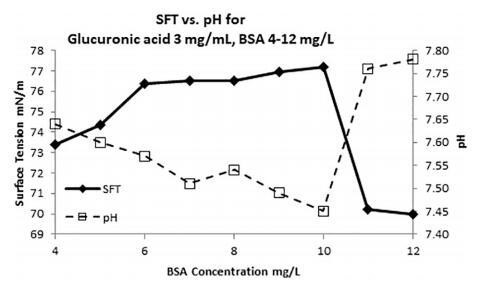 图 6. 改变 BSA 蛋白的溶液中糖醛酸(葡萄糖醛酸)浓度为 3 mg/L 时的 SFT(菱形)和 pH(空心方块) 浓度。 CMC,临界胶束浓度,在 BSA 浓度为 10 mg/L + 3 mg/L 葡萄糖醛酸。 pH 值变化约 0.3 个单位 SFT 范围为 7 mN/m。
