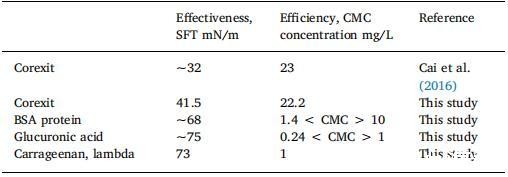 表 2 SFT 和 CMC 比较模型蛋白质和酸性多糖。 虽然Corexit 更有效地降低 SFT,EPS 模型成分更有效 因为需要低得多的浓度才能开始乳化(蛋白质)和 稳定成分(酸性多糖;结合大分子并添加 粘度)。