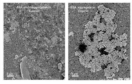 相同放大倍数下 BSA 聚集体的 SEM 图像(图 3b) 在 Corexit(左)和 ASW 中用 0.1% BSA 溶液制备 来自与图 3a 中相同的溶液的对照处理(右)。 这 Corexit 处理(左图 3b)显示来自液体的微聚集体 阶段。 对照处理(图 3b 右)显示了一个大结晶 蛋白质聚集体。 图 3a 和 3b 中描绘的结果支持 静电相互作用和共价键作用的重要性 在微聚集体形成中(Corexit 与 Ca2+ 离子突出显示 CTC) 和 Ca2+ 螯合中的配位共价键 CTC 和阴离子亲水部分(CEWAF、WAF 和对照 处理)形成比 Corexit 更少但更大的聚集体 治疗。
