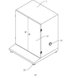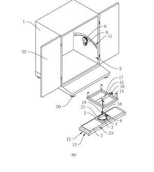 参照图1,包括壳体1、工作台2、盛液盒3和标准板4,壳体1内设置有工作腔5,壳体1底部设置有多个支撑脚20,在本申请实施例中,支撑脚20设置为四个,四个支撑脚20设置于壳体1的四角位置;壳体1上铰接有两转动门22;工作台2设置于工作腔5内,工作台2上开设有与盛液盒3适配的放置槽21,盛液盒3可放置于放置槽21中,标准板4设置于盛液盒3上方,标准板4通过升降结构可升降连接于壳体1上,工作台2上固定连接有水平仪6,在本申请实施例中水平仪6选用气泡式水平仪,也可选择其他体积较小的水平仪;工作台2和壳体1之间设置有用于调平工作台2的调平结构。