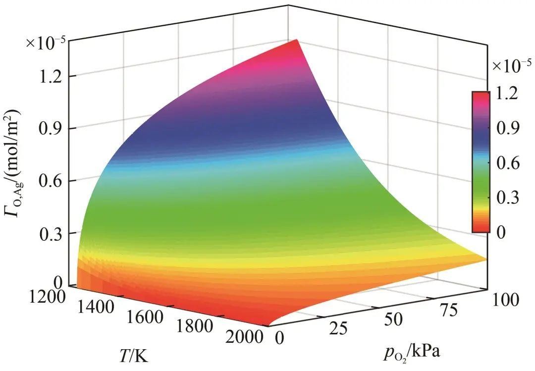 (3)当升高氧气压力,或降低体系温度时,表面过剩量逐渐增加。表面偏析因子则与氧气压力和温度均呈负相关,当降低氧气压力或温度时,O原子倾向富集于体系表面。