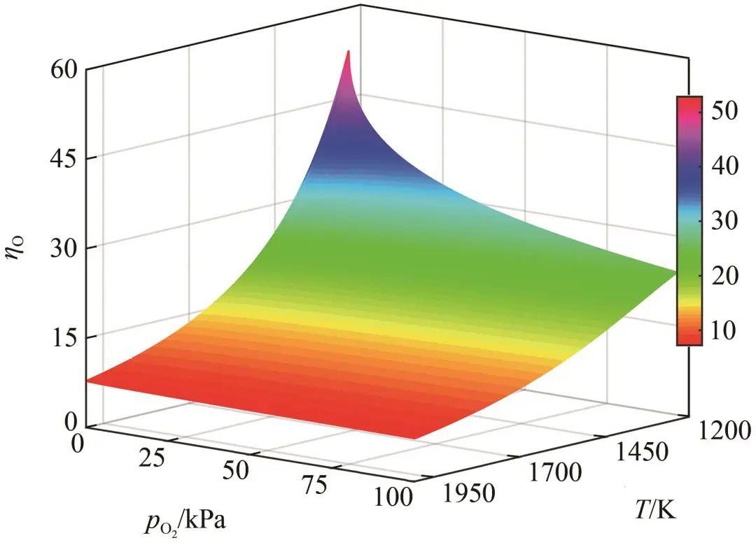 由图7可知,当温度低于1500 K时,ΓO,Ag随氧气压力升高显著增加;当温度高于1500 K时,由于液态Ag-O系中的氧溶解度显著降低,ΓO,Ag随氧气压力的增加,其增加幅度减小。观察图8可知,η随着温度和氧分压的升高而呈现下降趋势。这是因为式(27)中的表面偏析平衡系数KII与温度呈负相关,当温度升高时KII减小,导致表面氧浓度降低。此外,在较低的氧分压条件下,O原子倾向富集于表面;当氧分压升高时,更多的O原子溶入液态Ag-O系中,引起η减小。