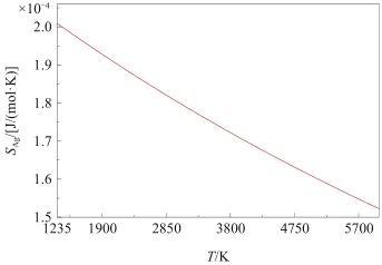 通过式(9)计算了液态Ag的表面过剩熵SAg(T),结果如图4所示。根据文献[36],理论上处于更高无序程度(熵)的物质状态在较高温度下更为稳定,因此,液体表面结构在较高温度下可能会出现有序-无序转变。然而,观察图4可知,在临界温度(6612 K)以下,SAg(T)随温度升高逐渐减小,这表明液态Ag表面总是保持有序结构。与此同时,液态Ag表面原子堆积比率与Ag(111)晶面相同的假设也得到了支持。此外,根据式(9)可知,SAg(T)∝a1/T2+a2/T,a1和a2为系数。这与前人研究结果略有不同,文献[37]基于Skapski模型推导得到SAg(T)∝a2/T,而文献[38]则根据杨氏方程推出SAg(T)∝a1/T2。