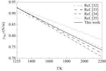 根据式(7),计算了液态Ag的表面张力γAg,T,结果如图3所示。总体上,随着温度的升高,γAg,T呈现近似线性下降的趋势。从图中可以看出,γAg,T的预测值与文献[32-34]具有较好的一致性,但略低于文献[35]。