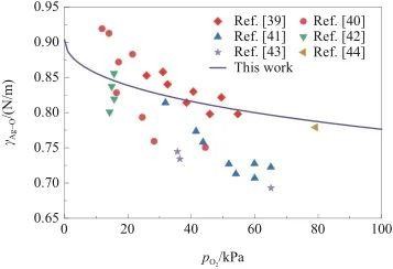 本工作从热力学角度出发,通过表面能与内聚能的比例关系,研究了液态Ag的表面张力和表面过剩熵。在此基础上,通过理想溶体近似模型简化Butler方程,研究了液态Ag-O系表面张力和表面过剩量关于氧气压力和温度的变化趋势,得到以下结论: