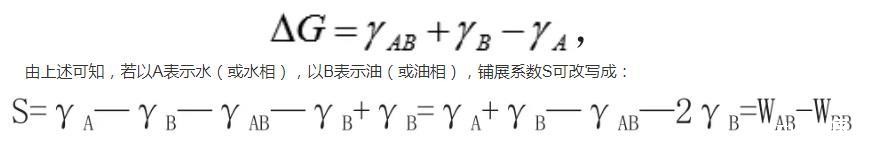 其中,WAB代表“油”与水的黏附功;而WBB则是油的内聚功。由此可知,当“油”与水的黏附功比这种“油”的内聚力还强时,“油”就会在水的表面上铺展。参照水在固体表面的铺展,此时可以说此种“油”类的亲水性较好。