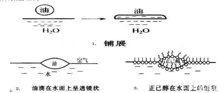 第二种方式,铺展方式。在上述的液-固界面的润湿作用,液体在固体表面的铺展也可以引用到液液界面,不过此时的铺展过程复杂一些。比如在清洁的水面上,滴加不溶性“油”滴,此时的“油”在水面上,可能表现出三种不同的状态: