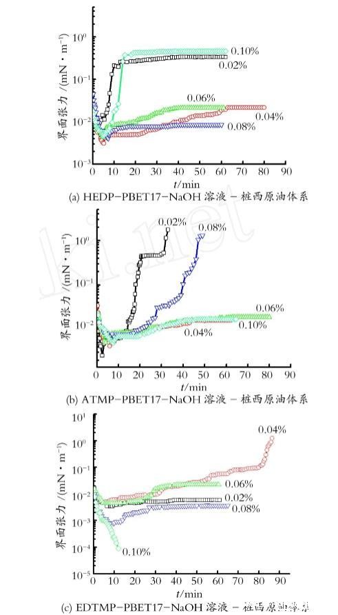 图4 HEDP-OPP4-NaOH,A TM P-OPP4-NaOH,EDTM P-OPP4-NaOH溶液-桩西原油体系的动态界面张力