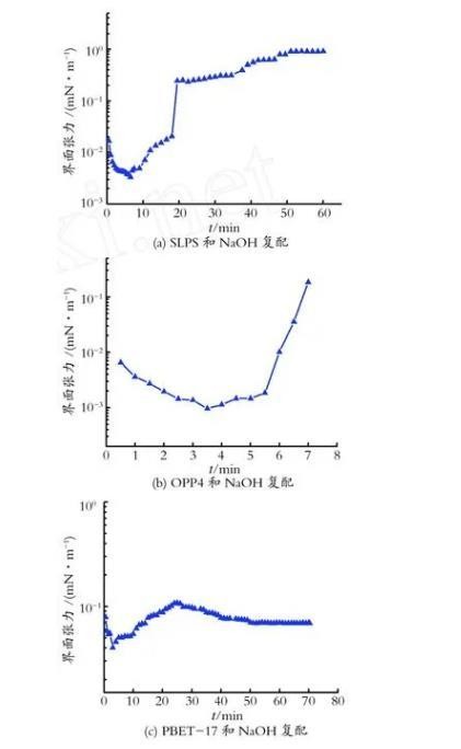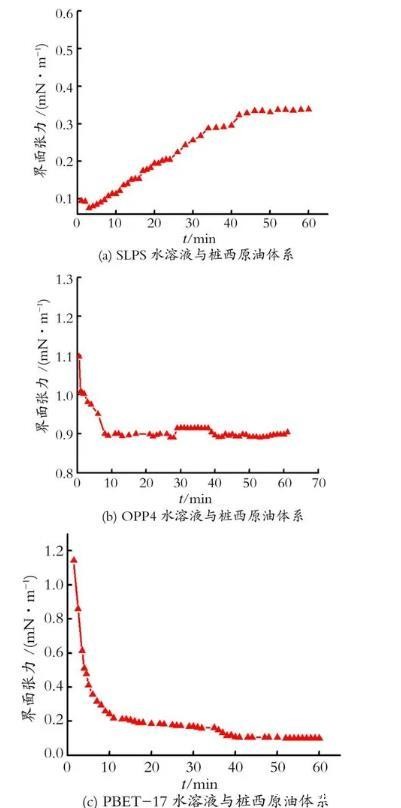 分别测定了SLPP、OPP4、PBET17质量分数为0.1%的水溶液与桩西原油体系的油-水动态界面张力,如图1所示。