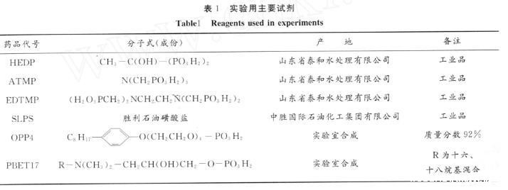 HEDP、A TM P和EDTM P 3种防垢剂在使用前已用NaOH中和p H至7左右,55℃(根据桩106-15-X18井底温度而定)下测定表面活性剂水溶液-稠油界面张力,测定前未作油-水体系平衡处理,实验选用的SLPS、OPP4和PBET17分别为阴离子型、非离子-阴离子型和阳离子-阴离子两性表面活性剂。
