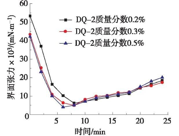 将一定质量浓度的十二烷基硫酸钠、椰子油脂肪酸二乙醇酰胺和十二烷基二甲基甜菜碱和适量的水置于三口烧瓶,并在60℃条件下进行搅拌至3种表面活性剂完全溶解,加入质量分数为5%的乙醇,搅拌30 min后制得低界面张力表面活性剂DQ-2。