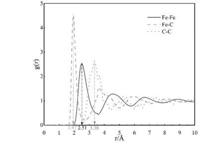 Fe-C二元体系经计算得到的径向分布函数,Fe-Fe、Fe-C、C-C原子对的平均键长分别为若原子间距离小于相应的键长值则表示两个原子之间互相连接,根据碳原子连接的铁原子个数,可将铁原子区分为自由态铁原子(与碳原子没有配位关系)、A型铁(只与1个碳原子形成配位关系)、B型铁(与2个或更多的碳原子形成配位关系)三种类别,根据模拟结果数据可对铁原子的配位方式进行分析。