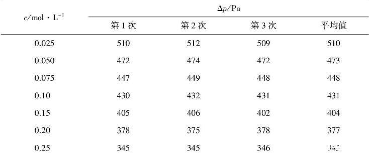 ⑥按照上述方法测定不同浓度正丁醇溶液的Δpmax值。不同溶液测定时须按低浓度到高浓度的次序测定;测定每一样品时只需要用同样浓度的溶液淌洗3次即可,并对测量数据进行记录(例见表1)。