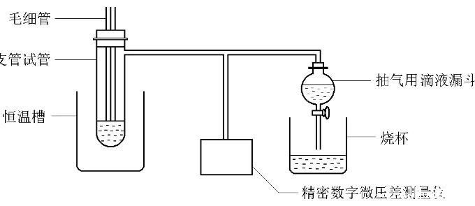 仪器:AF-02型数字式微压测量仪,数控恒温槽,5mL和10mL移液管各一支,碱式滴定管1支,50mL容量瓶9个,样品管1个,毛细管1个,抽气瓶1个,锥形瓶1个,玻璃漏斗1个。