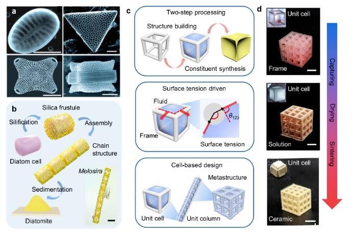 硅藻独特的生物矿化过程使硅藻拥有多种多样的硅酸盐外壳形貌(图1a)。不同于陶瓷3D打印的逐层增材制造,硅藻壳的生物矿化由结构成型和成分匹配两部分组成,硅藻细胞构成了最开始的有机骨架,而持续的硅化过程则进一步合成了硅酸盐外壳的主要成分。这种将结构成型和成分匹配分开的两步法策略可以有效提高合成速度。