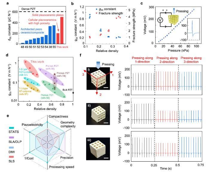 为进一步阐述所开发的STATS制造工艺的优异性,研究团队制备了一系列经过三维结构设计的多孔压电陶瓷,并对其机械性能和压电性能进行了表征(图2)。STATS法加工的多孔压电陶瓷具有整体多孔但局部致密的特点,即使在相对密度(多孔陶瓷与实心块体陶瓷的密度比值)较低的情况下(0.13-0.34),也能具有较高的断裂强度(1.0-3.9 MPa)和压电常数d33(200 pC N-1)。为进一步评估压电陶瓷超材料的压电响应,研究团队基于由周期性结构单元组成的有机骨架制备了一系列具有不同三维结构的多孔压电陶瓷,该方法加工的压电陶瓷展示出优异的压电响应和各向异性。
