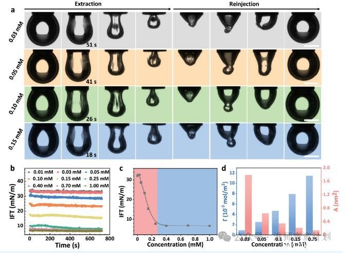 首先,在GL和SSD共组装之前,用垂滴张力法研究了GL在水-甲苯中的界面行为。如图1a所示,当提取浓度为0.03、0.05、0.10和0.15 mM的甲苯中GL水溶液的液滴时,分别在51、41、26和18 s时,液滴界面面积减小,在液滴界面上出现了明显的起皱。同样,当液滴完全虹吸到针管中并重新注入到初始体积时,起皱现象重新出现,液滴由不规则逐渐扩大到规则。抽注过程中起皱现象的出现,有力地揭示了水-甲苯界面处弹性膜的形成。图1b测量了GL溶液和甲苯之间的时间分辨界面张力(IFT)。当GL浓度<0.03 mM时,甲苯与GL溶液之间的界面张力近似等于纯水与甲苯之间的界面张力(≈32 mN·m−1)。随着GL溶液浓度从0.03增加到0.25 mN·m−1,界面张力下降到6.8 mN·m−1,而从0.25到1.00 mM,界面张力保持在6.8 mN·m−1不变当GL浓度<0.03 mM时,甲苯与GL溶液之间的界面张力近似等于纯水与甲苯之间的界面张力(≈32 mN·m−1)。随着GL溶液浓度从0.03增加到0.25 mM,界面张力下降到6.8 mN·m−1,而从0.25到1.00 mM,界面张力保持在6.8 mN·m−1不变。据此,确定0.25 mM为GL分子在水-甲苯界面处的临界胶束浓度(CMC)(图1c)。这意味着液滴在GL的CMC以下会发生收缩,而在CMC以上液滴会发生起皱。为了进一步解释这一现象,我们计算了不同浓度下GL分子的界面吸附容量和截面积。图1d我们可以看到GL的界面吸附量随浓度的增加成比例增加,相反,随着浓度的增加,横截面积减小。综上所述,GL是一种特殊的两亲分子,可以在油水界面形成界面膜。