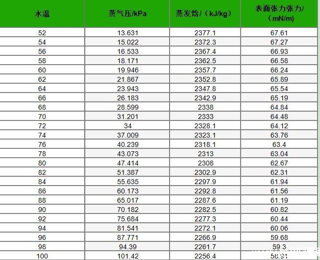 不同温度下水的蒸气压、蒸发焓及表面张力