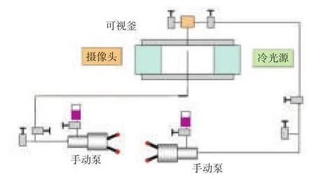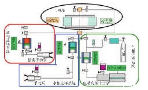 为了扩展高温高压润湿性及界面18luck国际的功能可以测量二氧化碳与原油最小混相压力,且可以使常温凝固的稠油等样品,实现顺利进样测量,需要对现有设备进行改造。首先,增加高温高压气体进样系统,主要包括气体增压泵、活塞容器及加热控温系统;其次,改进原有油相、水相进样系统,在手动泵与样品池之间增加微型活塞容器,在微型活塞容器、管线及阀门等加装加热控温系统。改进后的高温高压润湿性及界面18luck国际如图2所示。