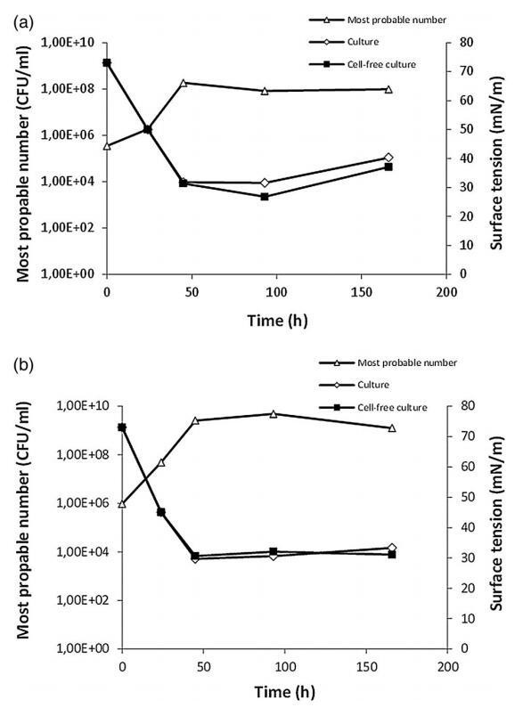 图 2. (A) 红球菌属的表面张力降低。 菌株LF-13; (B):红球菌属。 LF-22 菌株,在静息细胞条件下,含 2% (w/w) 煤油,有限氮源,20°C 和 160 rpm。 结果代表三个独立实验的平均值。