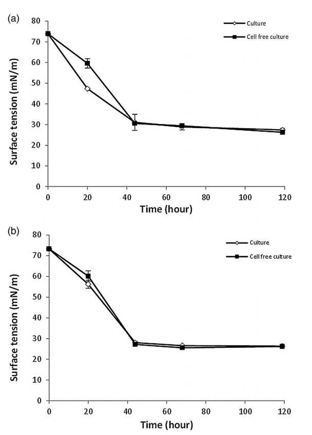 为了确定生物表面活性剂的合成是否与石油烃上的细菌生长有关,在磷酸盐缓冲液和煤油中对两种菌株 LF-13 和 LF-22 进行了静息细胞实验。 红球菌属的细胞悬液和无细胞培养滤液的表面张力。 LF-13 和红球菌属。 LF-22 静息细胞在培养 2 天后显示出显着减少,从 72 到 26 mN m-1(图 2)。 结果表明,红球菌菌株中的生物表面活性剂合成发生在煤油存在下,但不一定与煤油上的细菌生长有关。