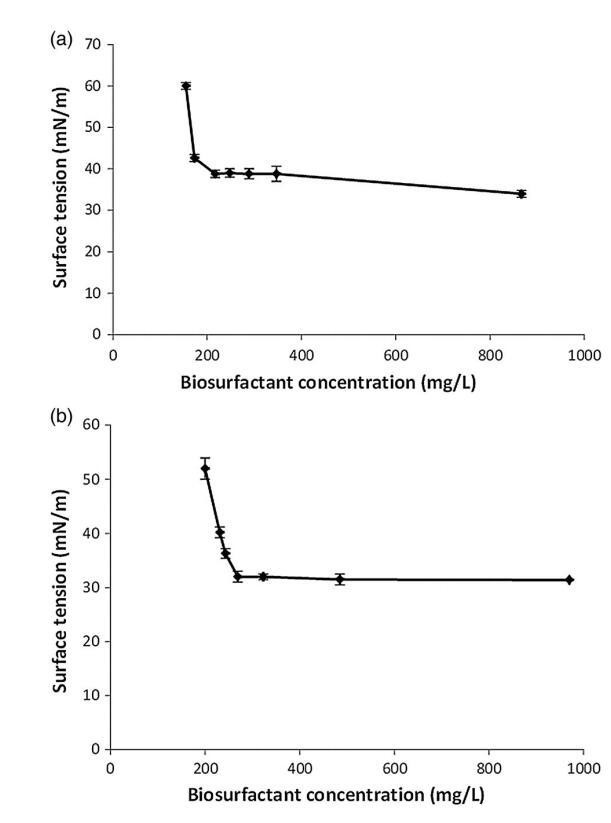 如材料和方法部分所述,使用 MTBE 从两种红球菌属菌株的静息细胞培养物中提取生物表面活性剂。 提取的生物表面活性剂用于测定CMC浓度。 来自菌株 LF-13 的生物表面活性剂的 CMC 约为 217 mg/L,菌株 LF-22 的 CMC 约为 269 mg/L(图 3)。