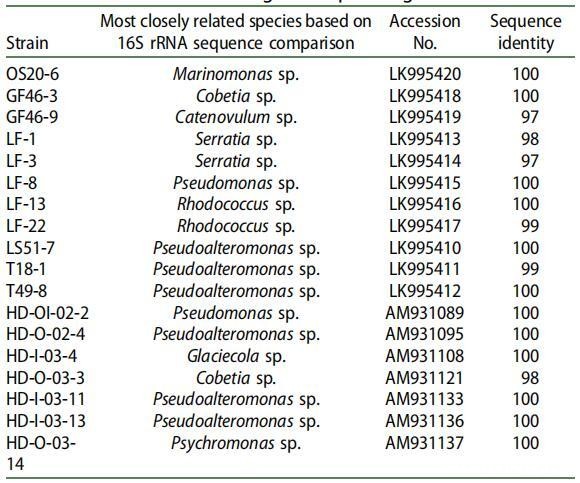 通过 16S rRNA 基因序列分析对具有显着 SAC 活性的 18 个分离株进行分类鉴定(表 2)。 红球菌除外。 菌株 LF-13 和红球菌属。 在菌株 LF-22 中,大多数鉴定的 SAC 生产者是革兰氏阴性菌,属于 γ-变形菌纲。 也有报道称 γ-变形菌在寒冷海洋地区的石油污染地点占优势。 [21-24] 先前对石油污染地点的研究表明,假单胞菌、假交替单胞菌、冰川、海藻和红球菌是极地、海洋区域。[21,22,25-28]
