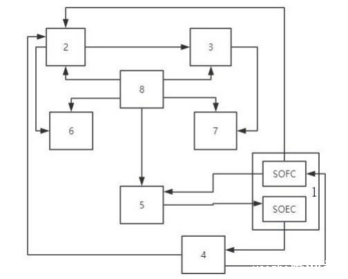 所述蓄热模块5包括汽水混合加热器51、蒸汽发生器52、稳压罐53,所述冷却模块8、SOFC燃料电池均与所述汽水混合加热器51的进口端连接,所述汽水混合加热器51的出口端与所述蒸汽发生器52的进口端连接,所述蒸汽发生器52的出口端与所述稳压罐53的进口端连接,所述稳压罐53的出口端与所述SOEC电解池连接,为SOEC电解池水解氢提供稳定的、洁净的水源。