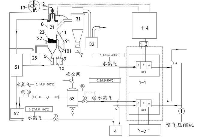 所述供电模块1中的SOFC燃料电池产生的水蒸气(0.2Mpa,400℃)进入所述汽水混合加热器51中,所述等离子喷射模块2、分离过滤模块3、粗粉收集罐6、细粉收集罐7与冷却模块8换热后的水(当冷却介质为水时)也进入所述汽水混合加热器51中,通过所述汽水混合加热器51的作用将其转化为水蒸气并传输到所述蒸汽发生器52中,所述蒸汽发生器52将水蒸气以(0.2Mpa,400℃)的状态传输到稳压罐53中,通过稳压罐53稳压并去除水蒸气中夹杂的水滴后,高温的水蒸气进入SOEC电解池中参与电解制氢,并通过储氢模块4将制备的氢气存储备用。该过程将分离提纯过程中供电模块1中燃料电池燃烧放电产生的高温水蒸气与冷却换热的热量加以回收利用,为SOEC电解池提供热量,避免或减少外部能量的输入,降低成本。