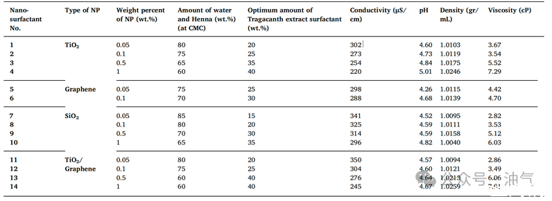 本研究研究了石墨烯、二氧化钛(TiO2)和二氧化硅(SiO2)纳米颗粒、TiO2和石墨烯的复合纳米粒子以及指甲花提取物表面活性剂的纳米复合物对降低油水界面张力的影响。研究人员使用溶胶-凝胶技术合成上述纳米颗粒,并采用天然水性悬浮表面活性剂(黄芪胶提取物)对纳米表面活性剂的稳定性进行了研究。通过电导率、浊度和界面张力实验测定了指甲花提取物表面活性剂的CMC值。为了稳定重量百分比不同且纳米颗粒类型也不同的纳米表面活性剂,使用粒径和zeta电位测量来确定黄芪胶表面活性剂各自的最佳浓度。最后,通过界面张力测量,使用稳定的纳米表面活性剂来研究其对IFT的影响。