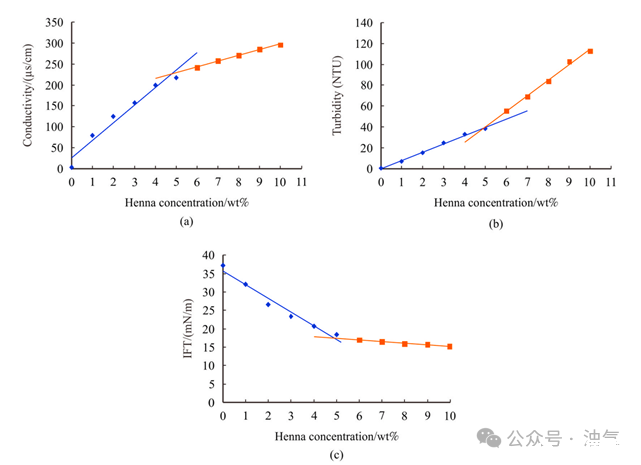 图1.(a)电导率、(b)浊度和(c)界面张力随指甲花溶液浓度的变化