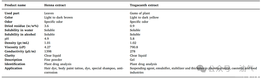 表1.指甲花和黄芪胶提取物的物性