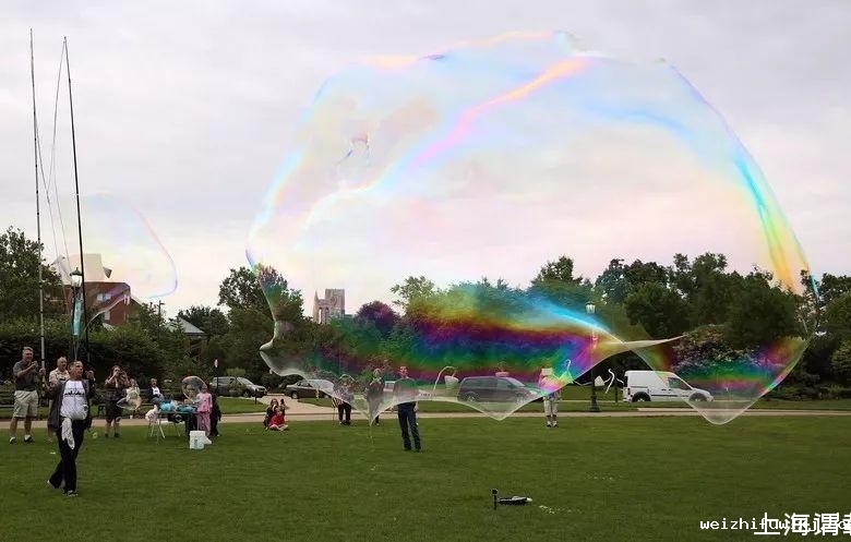 那么,世界上最大的肥皂泡到底有多大呢?目前的吉尼斯世界纪录是GARY PEARLMAN在2015年创造的,他用巨大的蘸有泡泡溶液的线框成功制造出了一个体积约有96.27立方米的巨大泡泡: