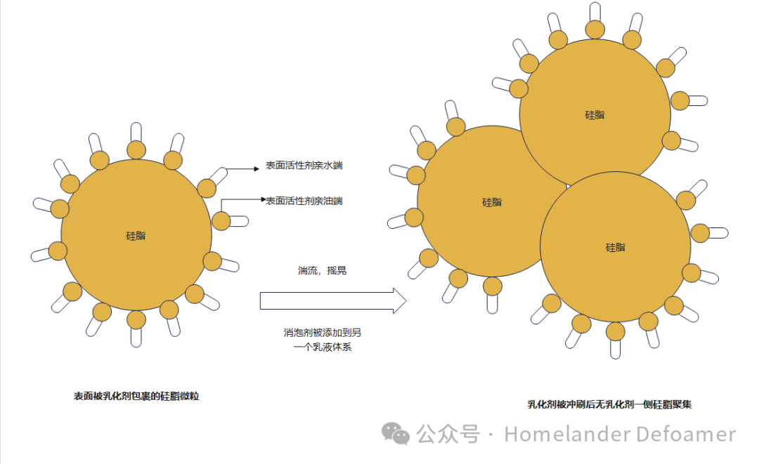 当这一种乳液滴加到另一种环境中,这样的环境没有大量的乳化剂,没有高粘度体系的支撑,微粒表面的乳化剂会慢慢从硅脂油粒表面脱落,油粒会在液体中做无规则碰撞,也会撞掉大量乳化剂。当表面乳化剂被全部冲刷撞掉,两个硅脂油粒会在下一次的碰撞结合在一起。这样的碰撞几率在平稳的液面较小,但在较为湍急的液面较大,会较为快的聚集为较大的絮状物。