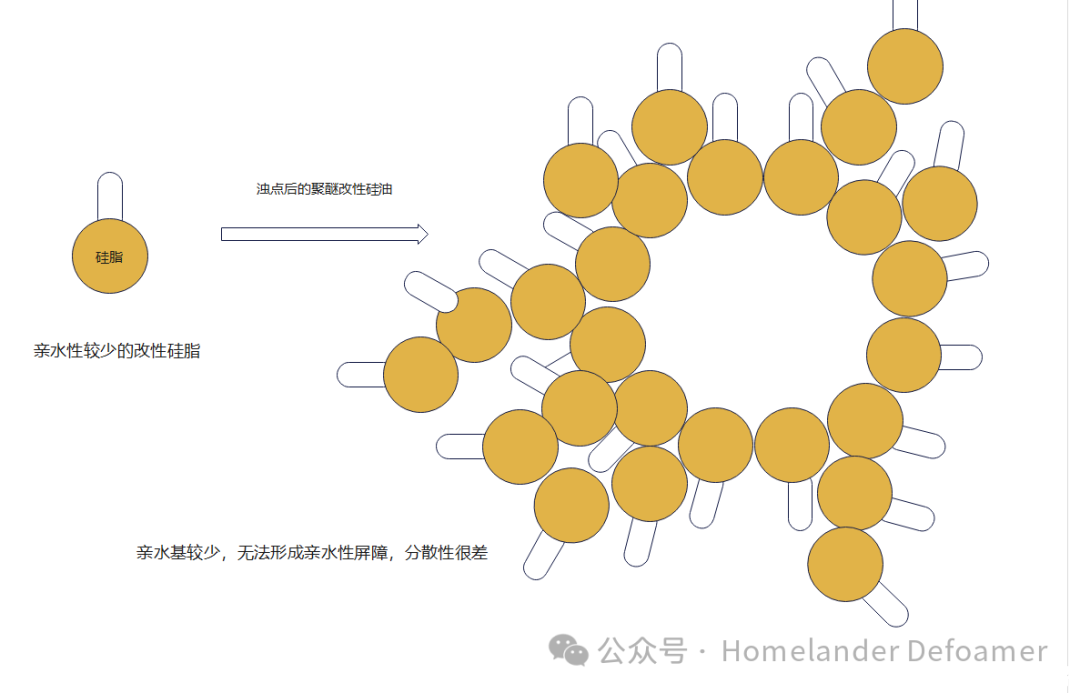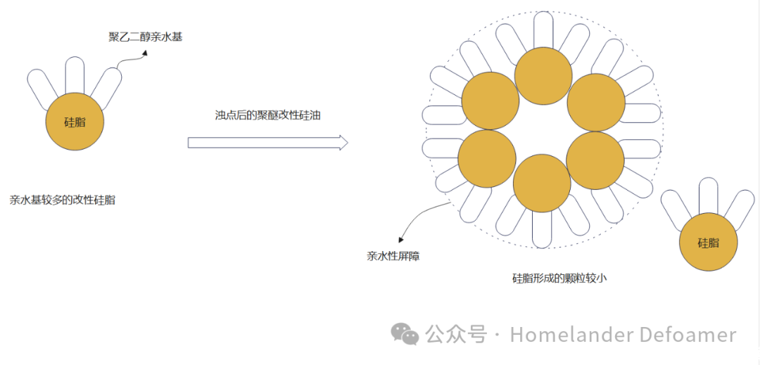 乳化剂既然很容易脱落,那么可以用化学键的方式,把乳化剂接枝在硅脂上,这样即使析出,在没有外加乳化剂和剪切力的情况下也能将析出的硅脂分散到体系中。这对亲水基与亲油基分子量的把控极其重要。若亲水基太大,形成水包油的颗粒太小,虽然不析出。但是太小的微粒排液时间久,消泡速度就很慢。
