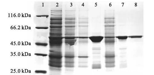 图1失活型VhPLD的表达与纯化SDS-PAGE电泳图注:1.蛋白marker;2.菌体破碎液;3.菌体破碎后离心所得上清液;4.菌体破碎后离心所得沉淀;5.镍柱纯化所得100 mmol/L咪唑洗脱峰样品;6.镍柱纯化的上样穿过峰样品;7.G-25柱纯化的洗脱峰样品;8.Q柱纯化的300 mmol/L氯化钠梯度洗脱峰样品。