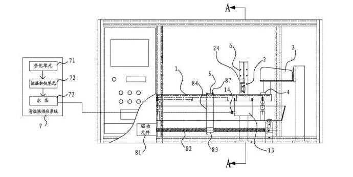 [0018]在一些实施方式中,还包括清洗液供应系统,清洗液供应系统包括净化单元、恒温加热单元和泵体。清洗液通过净化单元净化并通过恒温加热单元进行加热后,再经由泵体供应到清洗槽当中。其有益效果是,先通过净化单元,可以预先清除掉清洗液当中可能存在的油。另外,通过恒温加热单元可以将清洗液加热到一定的温度。因为温热状态的清洗液,可以实现更加的油脂清除能力,从而可以将样品上的油更方便且更完全的清洗下来。