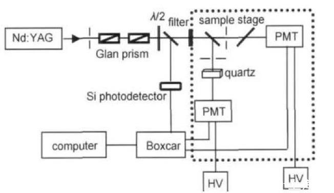 样品二次谐波产生实验装置如图2所示,光源为美国Continuum公司生产的锁模Nd:YAG皮秒激光器,激光器输出的基频光波长为1064 nm,能量为75 mJ,脉冲宽度为35 ps,重复频率为10 Hz,经过衰减,照射到样品上的单脉冲能量为2 mJ左右。激光束经过格兰棱镜,再通过一个半波片(用于调节入射光的偏振状态)后被分光镜分成两束,其中反射光用硅光探测器(Si photodetector)采集后传送到Boxcar门积分器上,用作Boxcar门积分器的触发信号。而透射光经过滤光片(filter)后进入黑暗的封闭空间(图中虚线所示,其作用为阻止外部的光线进入,以保证光电倍增管所探测的信号不受外界信号的干扰)后又被分光镜分成两束,其中的一束光直接照射到被测量的LB膜样品上,用于样品产生二次谐波信号,而另外一束光则照射到标准的Z切型的石英晶体上,测量标准石英样品的二次谐波信号来监测激光输出能量的变化。