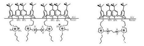 含氟杯芳烃离子盐化合物1按参考文献方法合成,其它所用试剂均为分析纯,从国药集团化学试剂有限公司购买,镀膜用氯仿重蒸后使用,实验用水为二次石英亚沸蒸馏水。π-A等温曲线测量和LB膜制备在KSV-5000仪器上(芬兰)进行,紫外光谱用U-3010紫外可见分光光度计(日本Hitachi公司)测定,红外光谱用Niconet 5700光谱仪测定,检测分辨率为4 cm-1,扫描32次消除基底噪音的影响。