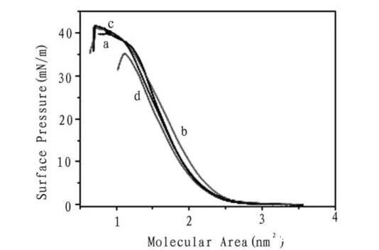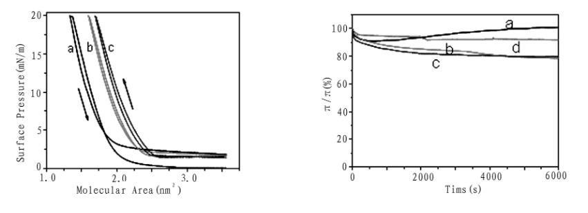 图3化合物1的压缩/扩张循环等温线(左图,a,b,c分别为1,2,3次)和不同亚相上的膜稳曲线(右图,a纯水,b乙二酸,c丙二酸,d丁二酸)