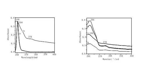 图4化合物1氯仿溶液(a)和LB膜(30层)的紫外光谱(b)(左图),在不同亚相(a)纯水,(b)乙二酸,(c)丙二酸,(d)丁二酸时转移30层膜的紫外光谱(右图)