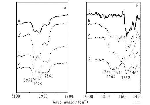 图5为化合物1在不同亚相时转移30层膜的FT-IR图,四种不同体系均在2958,2925和2861cm-1左右出现吸收峰,分别为杯芳烃两亲分子中芳环和脂肪链中C-H键的不对称伸缩振动。纯水亚相转移的膜,在1552 cm-1和1465 cm-1出现芳环骨架振动吸收峰,亚相为乙二酸,丙二酸,丁二酸等二元羧酸时,其转移的膜在1733 cm-1和1645 cm-1左右出现了有机羧基的特征伸缩振动,表明亚相中的二元羧酸阴离子与杯芳烃离子化合物1产生了离子识别,并通过静电作用结合在一起转移至基片上,得到杯芳烃双阳离子与二元羧酸阴离子的杂化多层膜。