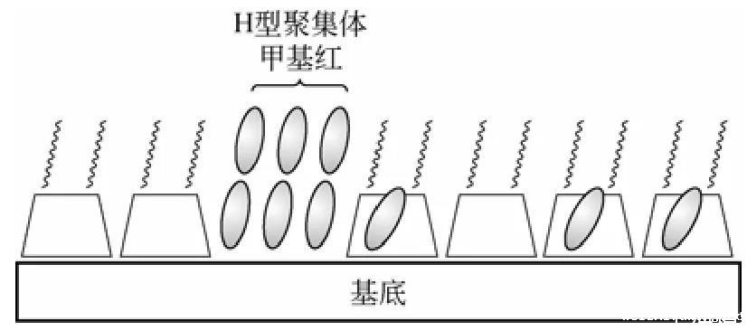 两亲性环糊精不仅能够单独组装成LB膜,也能够和其他有机分子共同组装成杂化LB膜。Matsumoto课题组在两亲性环糊精和偶氮苯LB杂化膜方面做了大量的工作。因为偶氮苯化合物能够在光照条件下发生可逆的顺反光异构反应,若将偶氮苯在固体基底上进行组装将对光储存、光转换器件的发展具有十分重要的意义。但是由于在单纯LB膜中,偶氮苯分子周围自由体积很小,限制了顺反光异构反应的发生,而利用两亲性环糊精和偶氮苯杂化组装成LB膜以解决这个问题。研究表明部分偶氮苯被包结在环糊精的空腔中,空腔为水溶性偶氮苯发生可逆的光异构化反应提供了良好的场所。此外,环糊精疏水链段也能够成为容纳客体分子的场所,而且在膜中并非所有的环糊精分子都会包结偶氮苯分子,剩余的未包结环糊精为进一步功能化提供了基础。但是在该杂化膜中会有部分偶氮苯分子形成的聚集体(图2),所以进一步增加杂化分子的包结率和分散性是这一类杂化膜的研究方向。