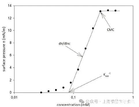 图1、表面活性分析(SAP):增加一种两亲性物质的浓度会导致更高的表面压力(π)。Kaw−1是空气-水分配系数,CMC是临界胶束浓度,dπ/dlnc斜率和描述物质在接口的横截面积。