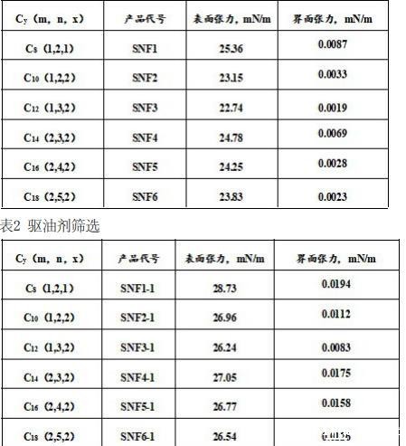 由表1可知,当m、n、x的摩尔比为1:3:2时,制得的驱、渗一体化驱油剂的亲油碳链主链长度为12,此时该驱、渗一体化驱油剂的表面张力和界面张力均达到最低值。