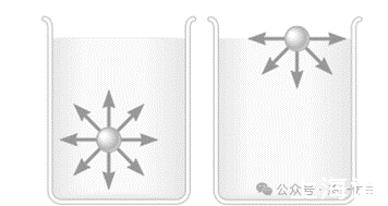 上图左边表示的是液体内部的水分子,受到周边水分子各个方向均匀的吸引力,合力为零;右边表示处于表面的水分子,受到下方水分子的吸引力,上方无水分子不存在吸引力,这样下方水分子合力不为零,方向往液体内部。