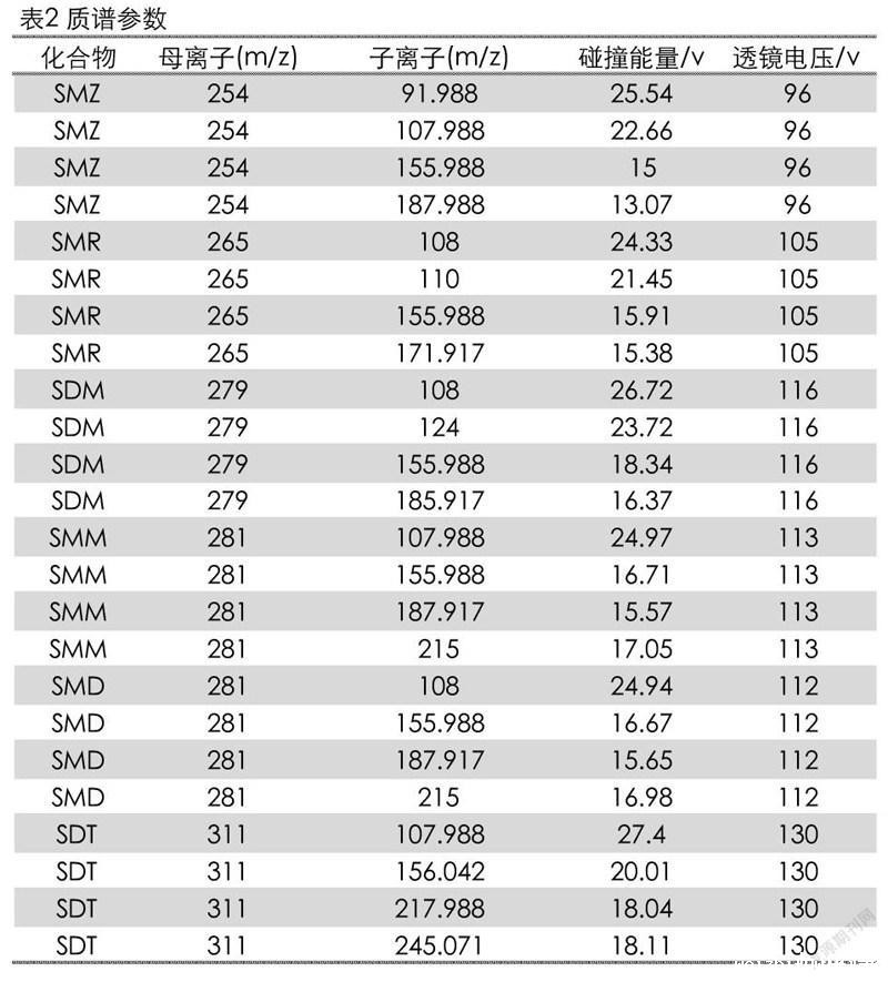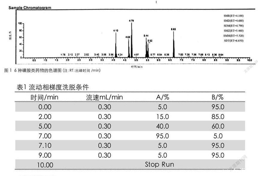 6种磺胺类标准物质:磺胺甲恶唑(SMZ)、磺胺甲基嘧啶(SMR)、磺胺间二甲氧嘧啶(SDM)、磺胺间甲氧嘧啶(SMM)、磺胺对甲氧嘧啶(SMD)、磺胺地索辛(SDT)(纯度均大于99.5%,北京振翔科技有限公司);乙腈(色谱纯,德国Merck公司);甲酸(色谱纯,上海安普实验科技有限公司)。