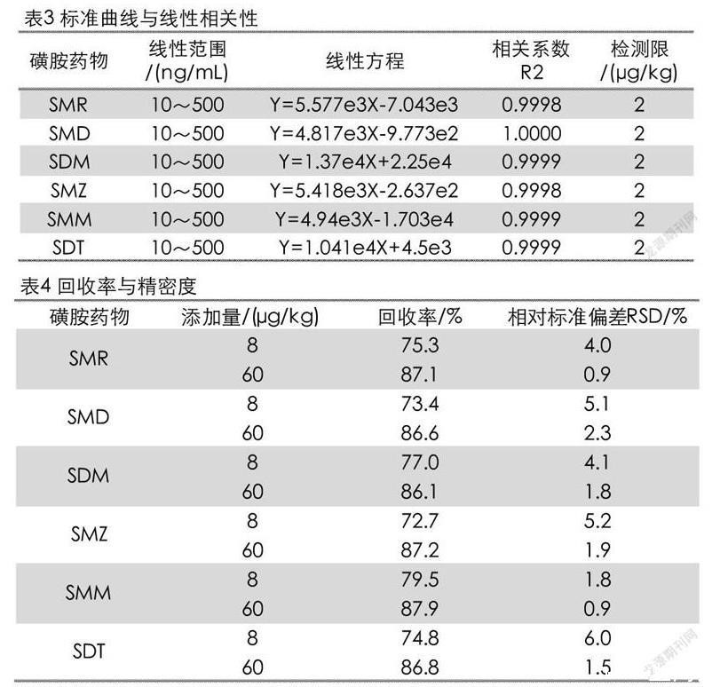 制备混合标准浓度系列,分别为10、50、100、250和500 ng/mL(分别相当于被测组分的含量为2、10、20、50和100μg/kg)。将标准工作液按照2.3.3的方法进样测试。以进样浓度为横坐标,以峰面积的响应值为纵坐标绘制标准曲线,结果如表3所。6种磺胺类药物在浓度10~500 ng/mL范围内线性关系很好,相关系数R2≥0.9998。